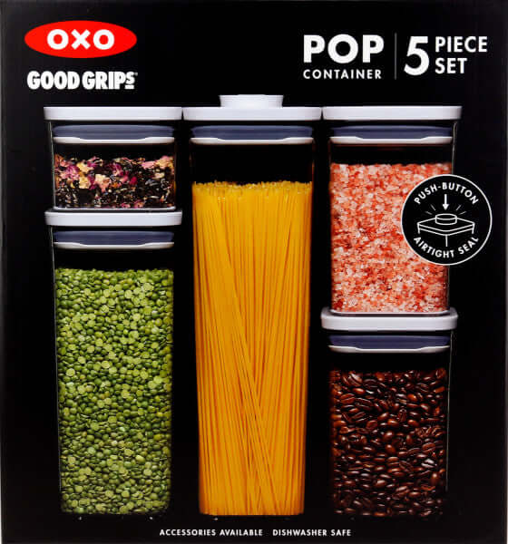 - OXO Good Grips 5-Piece POP Container Set is airtight, stackable, space-efficient and now dishwasher safe, making it easy to keep your dry foods fresh and your pantry organized