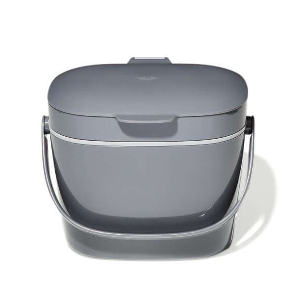 Uncomplicate composting with the OXO Good Grips Compost Bin. Designed to sit on countertops, Bin is designed to keep composting bags tucked inside for a neat look. The 1.75-gallon/6.62-liter capacity makes it perfect for culinary creatives, but the easy-to-use, stay-open lid makes it easy for anyone to use. The lid helps keep odors from escaping and the smooth interior makes it a breeze to clean, even if you don?t use composting bags. The convenient handle makes transporting the Bin easy, and the handle folds down out of the way when not in use. The internal bucket is removable and dishwasher safe for thorough cleaning.