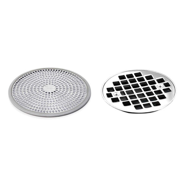 This rust-proof stainless steel Drain Protector sits flat on shower stall drains so it doesn't get in the way. The hole pattern effectively catches hair without blocking water drainage. A silicone rim keeps the Drain Protector in place and prevents it from sliding around.