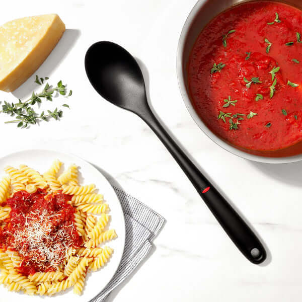 The Nylon Spoon is perfect for stirring soups, sauces, stews and chili. Our nylon tools are a cut above, featuring oversized heads, extra-long, sturdy necks and comfortable grips. Heads are high heat resistant and won't scratch non-stick cookware.