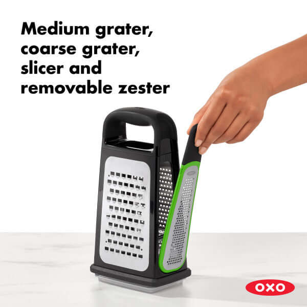 This OXO Good Grips Box Grater with Removable Zester has an angled slicing blade, medium and course grating blades, and a removable zester. The soft handle offers a secure, slip-free grip while its non-slip foot provides added control when grating.