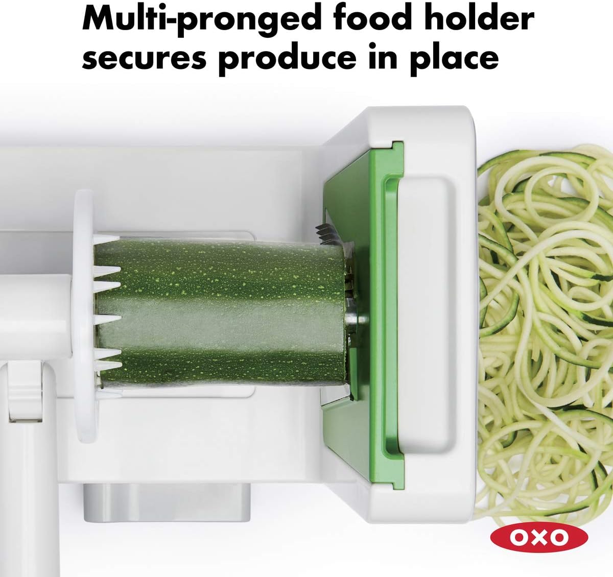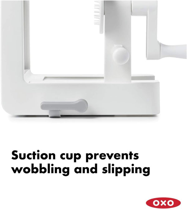 Our Spiralizer is perfect for creating vegetable noodles, a tasty, healthy alternative to pasta. You can also use it to make uniform spirals for curly fries, salads, garnishes and more. Three interchangeable stainless steel blades create spaghetti cut (1/8th inch), fettuccine cut (1/4th inch), or ribbon cut noodles, and a Stronghold™ suction cup prevents wobble on countertops. The removable blade box keeps blades clean, safe and organized when not in use and stores on board.
