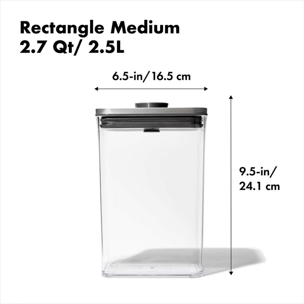 Push the button on the stainless steel lid to create an airtight seal; press it again to pop it up for easy opening. More shapes and sizes provide more possibilities for storing everyday must-haves like flour, sugar, coffee, cereal, oatmeal, grains, pasta and spices. With a handy fill line to guide you, curved corners for smooth dispensing and sturdy, BPA-free construction, these canisters take tidying to the next level. POP Containers aren?t just for kitchens: Use them any place you want more organization. OXO expanded the possibilities of POP with a line of solution-based accessories that conveniently attach to lids. Accessories sold separately.