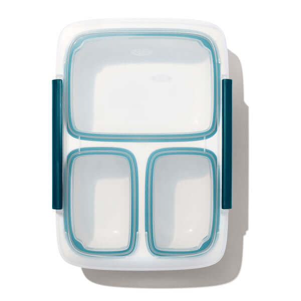 The OXO Good Grips Prep & Go 4.1-Cup Divided Container features three compartments in one. Fill one side with grilled chicken and the other with veggies and grains, or use it for soup and a salad, or oatmeal with fruit and other toppings. The leakproof lid features three silicone gaskets to keep liquids contained, and two locking clips for extra reassurance. The base even features stay-cool handles for easy microwave-to-table transport. And while the whole thing looks like elegant ceramic, it?s actually a much lighter BPA-free container that can help you replace single-use plastic. Dishwasher safe.