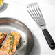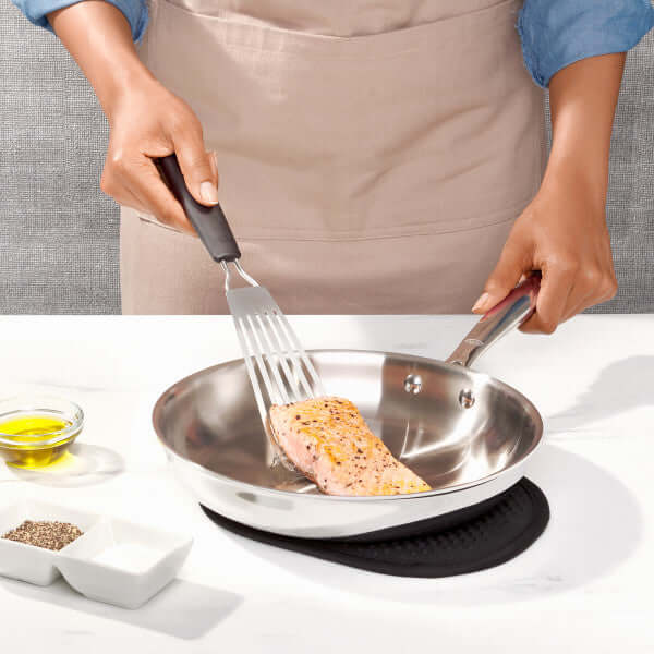 While it is ideal for cooking filets, searing scallops and pan-frying fish cakes, it?s also a great option for delicate foods like crepes and omelets. The flexible head and beveled edge slide easily beneath foods, and the slotted design allows grease to drain when flipping foods like burgers. The durable, stainless steel head can flip veggies and the soft handle provides a comfortable grip. Dishwasher safe