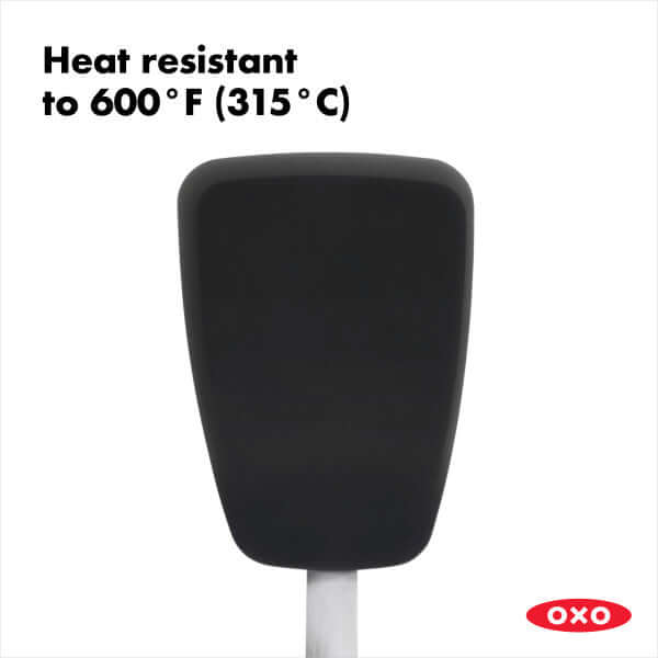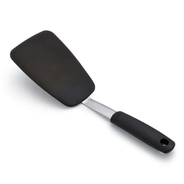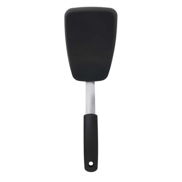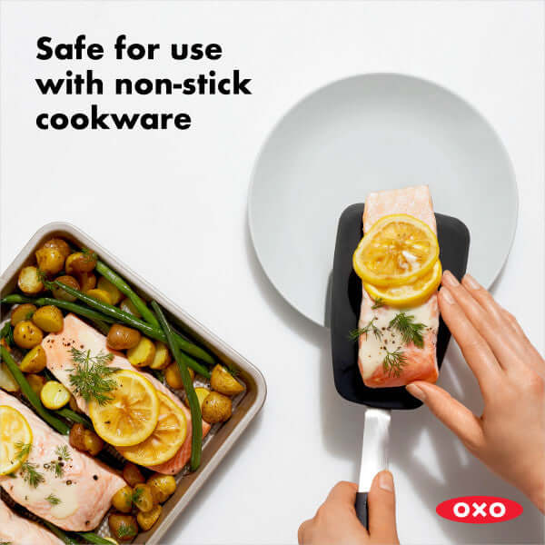 The OXO Good Grips Large Silicone Flexible Turner is a versatile addition to any kitchen. Its thin design slides easily under delicate foods like eggs but is sturdy enough to flip burgers. It?s safe for non-stick cookware, so you can flip crepes without bunching them and turn fish without breaking it. Our nimble Turner is constructed of heat-resistant silicone bonded to flexible stainless steel for durability. It has a soft, non-slip handle to keep you comfortable even when you?re serving up cookies for a crowd. Dishwasher safe.