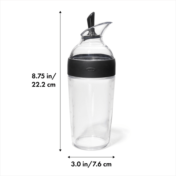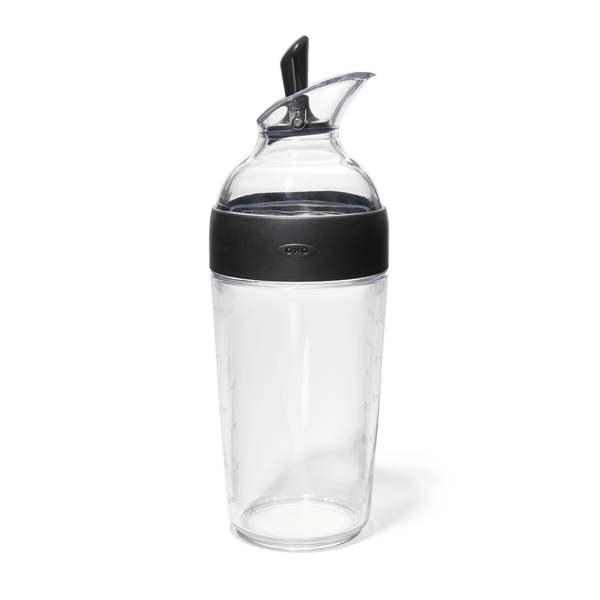 Mix, serve and store dressings, sauces, marinades and more with the OXO Good Grips Salad Dressing Shaker. The wide Shaker top unscrews for adding a range of ingredients like oil, vinegar, mayonnaise, mustard, garlic, onions and spices. Cup, milliliter and ounce markings are printed on the side for easy measuring. Once ingredients are added, simply screw the top closed and shake the watertight container to quickly mix. Flip the top lever back to pour and forward to seal. The 1.5-cup-capacity Shaker is dishwasher safe, highly durable and BPA free.