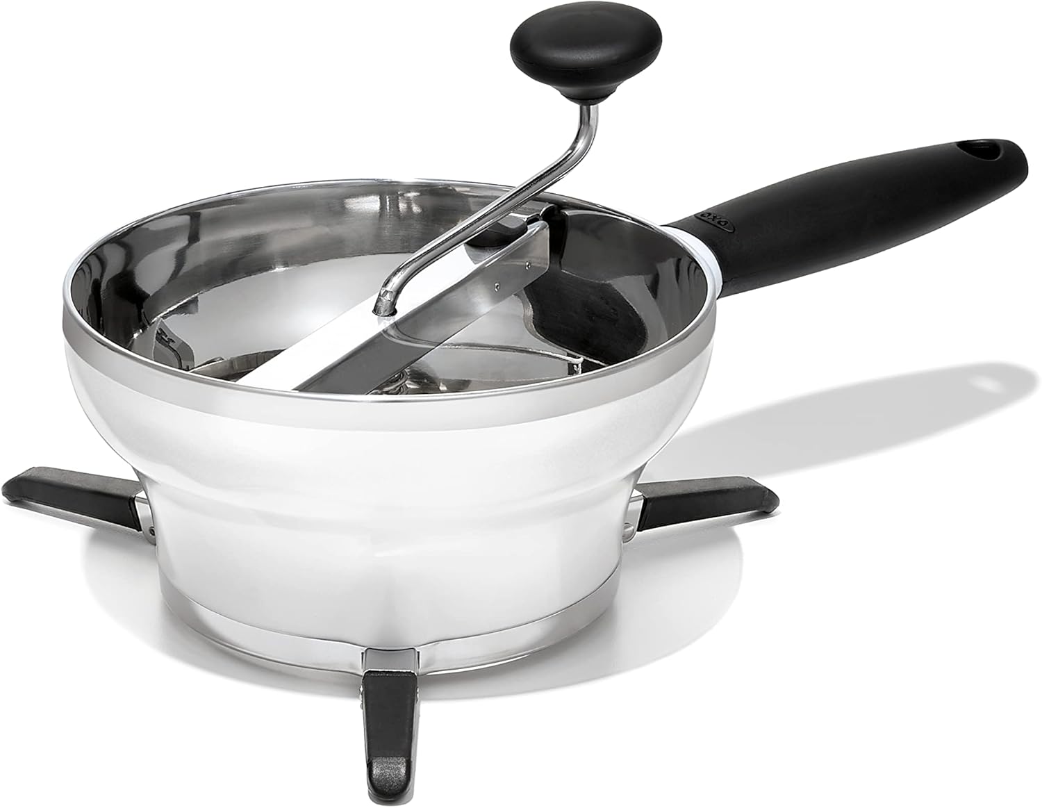 Whether you’re preparing hot or cold foods, the stainless steel inner bowl helps preserve temperature and won’t stain. Includes three grinding discs for fine, medium and coarse textures. Unique release button makes it easy to exchange discs and disassemble. Legs fold for easy storage.