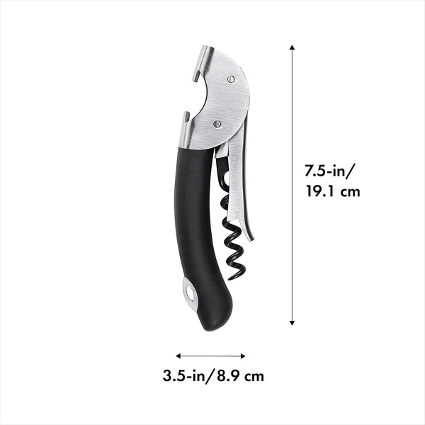 Our Double Lever Waiter's Corkscrew combines slim, compact form with no-fuss function. The non-stick screw glides smoothly into corks, then the second lever retracts for easy cork removal. Bottle opener is integrated into the comfortable, non-slip handle. Foil cutter folds out of the handle.