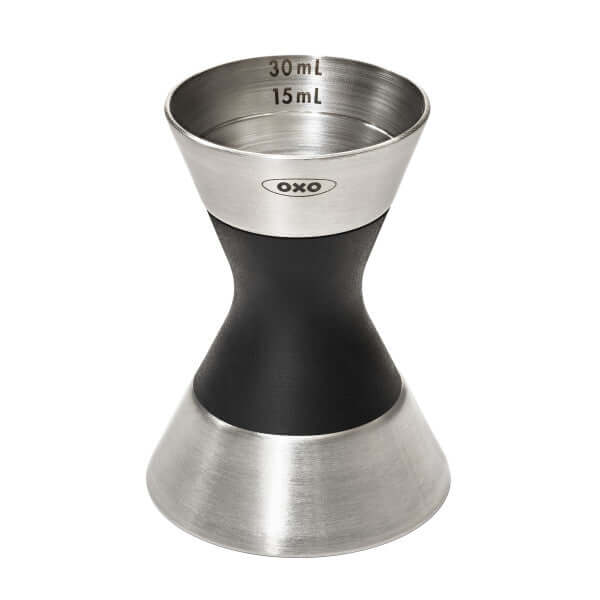 One side of the OXO Steel Double Jigger features laser-etched measurement markings for 1/3 ounce, 3/4 ounce and 1-1/2 ounce (one jigger), while the second side has markings for 1/4 ounce, 1/2 ounce and 1 ounce. A soft non-slip grip wraps around the durable stainless steel body for comfortable handling. Dishwasher safe.